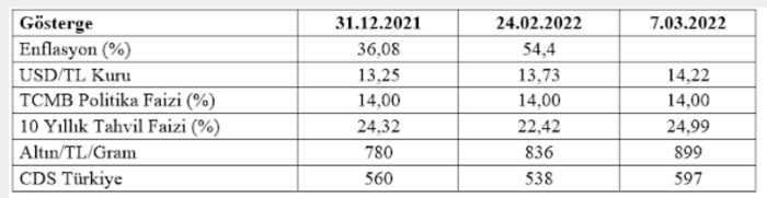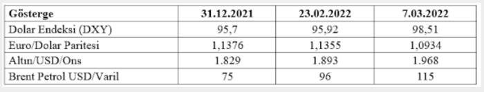 Türkiye’de finansal göstergelerin savaş başındaki durumuyla ilk 9 gün sonundaki durumunu geçen yılın son günündeki göstergelerle birlikte aşağıdaki tabloda gösteriyoruz: