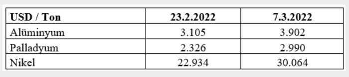 Rusya, özellikle otomotiv sanayiinde kullanılan dört önemli metalin (alüminyum, paladyum, titanyum ve nikel) önde gelene üreticilerinden birisi konumunda bulunuyor. Şimdiden bu metallerin fiyatlarında önemli artışlar söz konusu oldu. Aşağıdaki tablo bu gelişimi gösteriyor:
