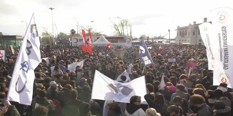 İstanbul’un Kadıköy ilçesi, bu akşam saatlerinde üniversite öğrencilerinin adalet çağrısına sahne oldu. 19 Mart’ta başlayan operasyonların ardından tutuklanan arkadaşlarının serbest bırakılmasını talep eden öğrenciler, Kadıköy İskele Meydanı’nda bir araya geldi. Protestoda sık sık “Kurtuluş yok tek başına, ya hep beraber ya hiçbirimiz” ve “Faşizme karşı omuz omuza” sloganları atıldı.