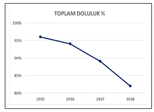 oranları devlette 2015 yılında %99’dan 2018 yılında %85’e, vakıflarda ise 2015 yılında %91’den 2018 yılında %73’e düşmüştür. Toplam doluluk oranının sadece 3 yıl içinde 15 puan birden (%96’dan %81’e) düşmesi yükseköğretim talebinde ciddi bir değişimin yaşandığını göstermekte. Üniversitelerin doluluk oranları ile ilgili olarak Hocanın hazırladığı grafiği yanda görmektesiniz.