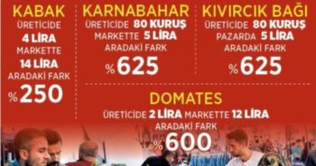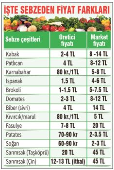 Milliyet gazetesinden Duygu Erdoğan’ın haberine göre, üretici ‘kazanamıyoruz’ derken, komisyoncular ise 3 liraya aldıkları bir ürünün markette 8 lira olmasını ‘makul’ olarak ifade ediyor. Tüketici ise sofrasına getireceği hemen her sebzenin pahalılığından, elma portakal gibi ‘bol ve gündelik’ meyvelerin bile 10 liraya yaklaşan fiyatından şikayetçi. Genel olarak bakıldığında üreticiden çıkan sebze/meyve, tüketicinin sofrasına ortalama 3 kat fiyat artışı ile geliyor. Bazı ürünlerde bu oran yüzde 500 oluyor. Marketteki fiyata şaşıran tüketici gibi, üretici bölgelerde de tüm bu oranlar şaşkınlıkla karşılanıyor. Çünkü üretimde büyük bir sorun görünmüyor.
