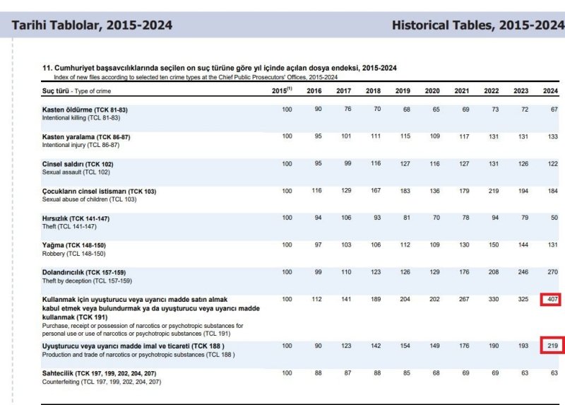 Aynı dönemde uyuşturucu imal ve ticareti (TCK 188) suçlarında da ciddi bir yükseliş var. 2015’te 100 olan endeks, 2024’te 219’a çıktı. Artış oranı, kullanım suçlarına kıyasla daha sınırlı kalsa da, ticaret suçlarının da iki kattan fazla arttığını gösteriyor. Bu tablo, uyuşturucunun toplumsal yaygınlığının derinleştiğine işaret ediyor.