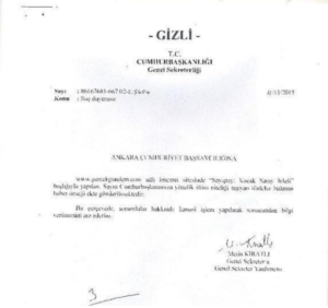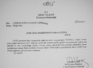 01/04/2017 tarihinde, Kilis İl Emniyet Müdürlüğü tarafından, Kilis Ağır Ceza Mahkemesi Başkanlığına gönderilen ‘Gizli’ ibareli o belgede, şu ifadeler geçiyor: “…Mahkemenizde, yargılamaları tutuklu olarak devam eden şüpheli/sanıkların 2017 mart ayı içerisinde mahkemenizde görülen duruşmalarda verilen ara kararlar ile veya tutukluluğa itirazlar sonucu salıverilmelerinin gerekçe gösterilen karar içeriklerinin onaylı birer suretinin Emniyet Genel Müdürlüğü’ne gönderilmek üzere Kom Şube Müdürlüğümüze gönderilmesi hususunu…”