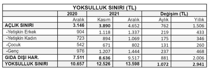 Diğer zorunlu harcamaların da hesaba katıldığı yoksulluk sınırı ise 13 bin 598 liraya yükseldi. Geçen yılın aralık ayında bu rakam 10 bin 657 liraydı. Bir yıldaki artış 2 bin 941 lira oldu.