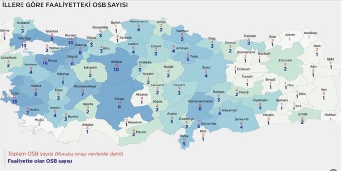 İhracatçı ekonominin kilit noktaları olan OSB’lerin coğrafi dağılımına ve istihdam yapısına bakmak gerekiyor. Kuruluş onayı verilen 378 OSB’nin 270’inde üretim yapılıyor. Sanayi ve Teknoloji Bakanlığı tarafından kuruluş onayı verilerek altyapı inşaatlarını tamamlayan ve üretime geçen OSB’lerde doluluk oranı yüzde 83, tahsis dolulukları ise yüzde 90 seviyesinde; iki milyondan fazla işçi istihdam ediliyor.[2] Faaliyette olan OSB’ler ağırlıklı olarak batıda ve iç kesimlerde