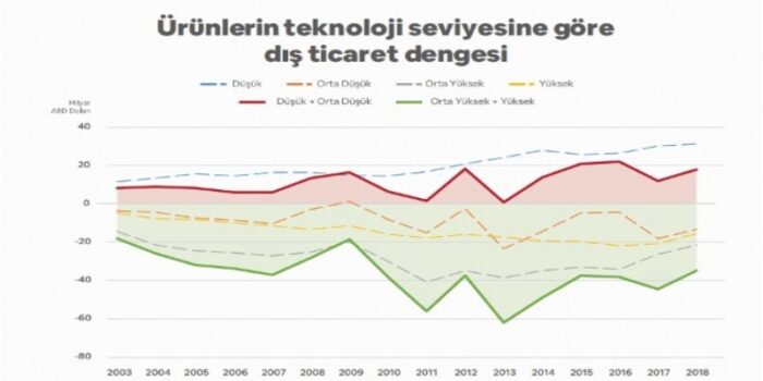 Söz konusu raporda, Türkiye imalat sanayiinin son 20-25 yıl içinde teknoloji içeriği düşük olan sektörlerin ağırlıkta olduğu bir yapıdan orta ve orta-yüksek teknolojili ürünlerin üretildiği sektörlerin önem kazandığı bir yapıya doğru evrildiği belirtiliyor, ancak sanayide yapısal dönüşümün durakladığı ve yüksek teknolojili ürünlere doğru bir hareketin gerçekleşmediği söyleniyor. İhracatın sofistikasyonu ve teknoloji içeriğine ilişkin verilere göre 2000’li yılların ortalarına kadar ihracatta da düşük teknolojili ürünlerden orta ve orta-yüksek teknolojili ürünlere bir yönelim gerçekleşmiş; 2000’li yılların ortalarından itibaren ise teknolojik yenilenmenin durağanlaştığı ve yüksek teknolojili ürünlerin ihracattaki payının kayda değer bir artış̧ sağlamadığı görülüyor.